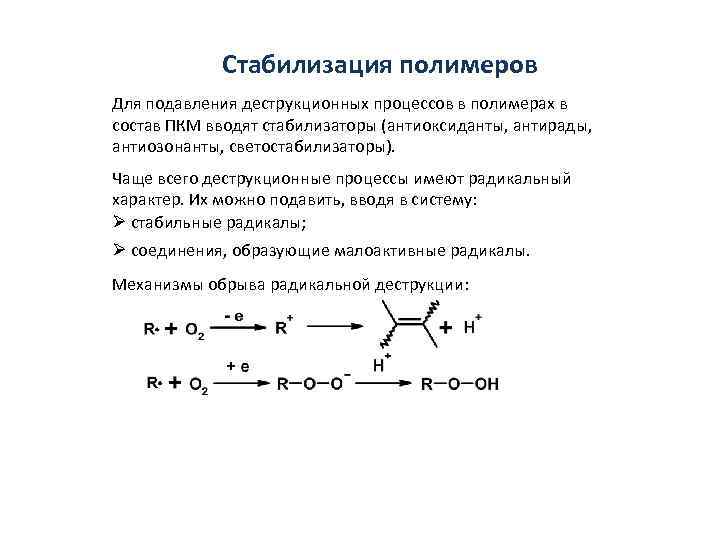 Стабилизация полимеров Для подавления деструкционных процессов в полимерах в состав ПКМ вводят стабилизаторы (антиоксиданты, антирады, антиозонанты, светостабилизаторы). Чаще всего деструкционные процессы имеют радикальный характер. Их можно подавить, вводя в систему: Ø стабильные радикалы; Ø соединения, образующие малоактивные радикалы. Механизмы обрыва радикальной деструкции: