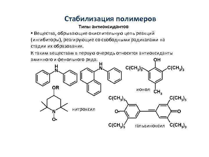 Стабилизация полимеров Типы антиоксидантов • Вещества, обрывающие окислительную цепь реакций (ингибиторы), реагирующие со свободными радикалами на стадии их образования. К таким веществам в первую очередь относятся антиоксиданты аминного и фенольного ряда. ионол нитроксил гальвиноксил