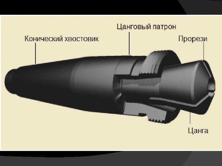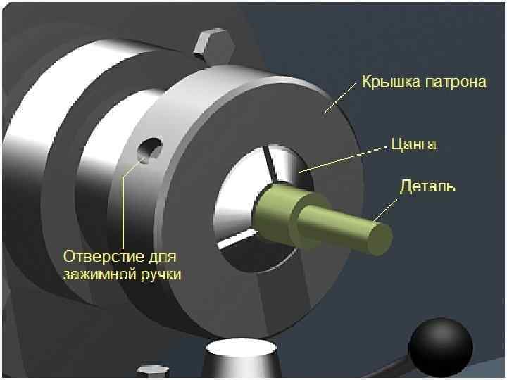 Крепление деталей в цангах основано на том, что обрабатываемая деталь вставляется в торцевое отверстие цанги. Цанга вдавливается в цанговый патрон и, за счёт прорезей в цанге и её конической поверхности, прорези сужаются и, соответственно диаметр отверстия цанги уменьшается, обжимая деталь. Цанга вдавливается в патрон при помощи резьбовой крышки цангового патрона. Чаще всего, крепление заготовок в цангах, используется для чистовой обработки деталей.