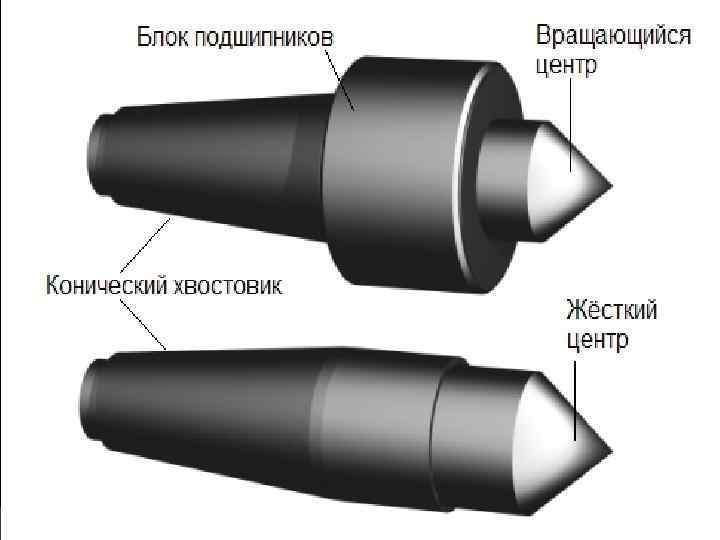 При обработке деталей со значительной длиной и небольшим диаметром используется обработка в центрах. В простейшем случае заготовка закрепляется в патроне, а торцевая часть заготовки поджимается центром. При таком креплении, деталь следует обрабатывать за одну установку. Центр крепится в пиноли задней бабки за счёт конического хвостовика.