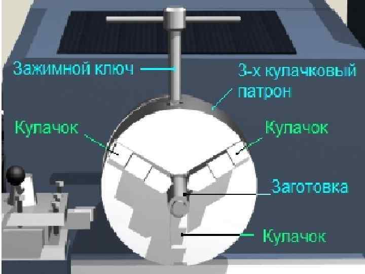 Наиболее распространённый способ крепления заготовок на токарном станке, это крепление заготовок в самоцентрирующемся трёх кулачковом патроне. При вращении зажимного ключа по часовой стрелке происходит перемещение сразу всех трёх кулачков к центру патрона. При этом происходит закрепление заготовки. При вращении ключа в обратную сторону происходит освобождение заготовки. При использовании в качестве заготовок длинных прутков, следует иметь в виду, что диаметр прутка не должен превышать диаметра отверстия шпинделя станка.
