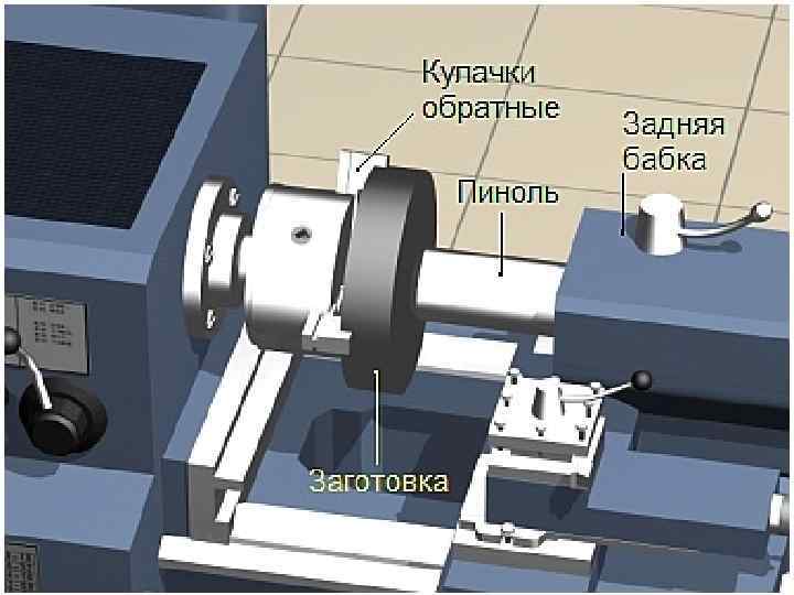 При закреплении заготовок большого диаметра, в патрон следует установить обратные кулачки. Заготовка, при закреплении, должна быть плотно прижата задней торцевой поверхностью к боковым поверхностям кулачков. Для удобства крепления, можно воспользоваться задней бабкой, "поджав" заготовку, и затем зажимным ключом закрепить заготовку. После этого заднюю бабку следует отодвинуть вправо.