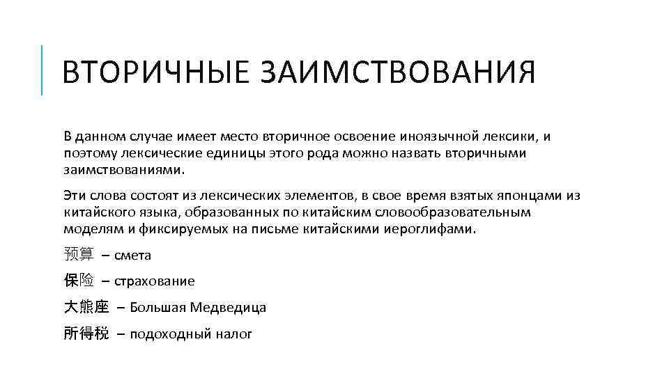 ВТОРИЧНЫЕ ЗАИМСТВОВАНИЯ В данном случае имеет место вторичное освоение иноязычной лексики, и поэтому лексические единицы этого рода можно назвать вторичными заимствованиями. Эти слова состоят из лексических элементов, в свое время взятых японцами из китайского языка, образованных по китайским словообразовательным моделям и фиксируемых на письме китайскими иероглифами. 预算 – смета 保险 – страхование 大熊座 – Большая Медведица 所得税 – подоходный налог