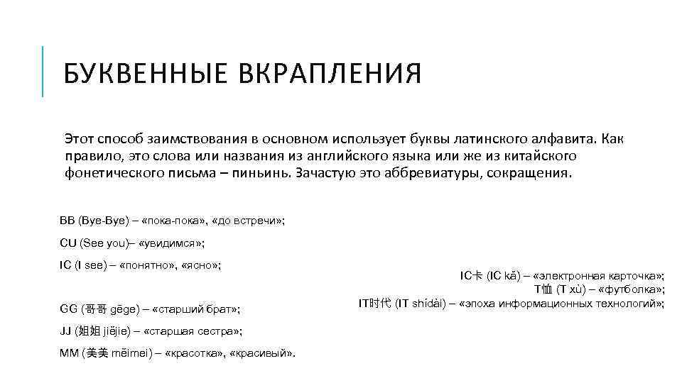 БУКВЕННЫЕ ВКРАПЛЕНИЯ Этот способ заимствования в основном использует буквы латинского алфавита. Как правило, это слова или названия из английского языка или же из китайского фонетического письма – пиньинь. Зачастую это аббревиатуры, сокращения. BB (Bye-Bye) – «пока-пока» , «до встречи» ; CU (See you)– «увидимся» ; IC (I see) – «понятно» , «ясно» ; GG (哥哥 gēge) – «старший брат» ; JJ (姐姐 jiějie) – «старшая сестра» ; MM (美美 měimei) – «красотка» , «красивый» . IC卡 (IС kǎ) – «электронная карточка» ; Т恤 (T xù) – «футболка» ; IT时代 (IT shídài) – «эпоха информационных технологий» ;