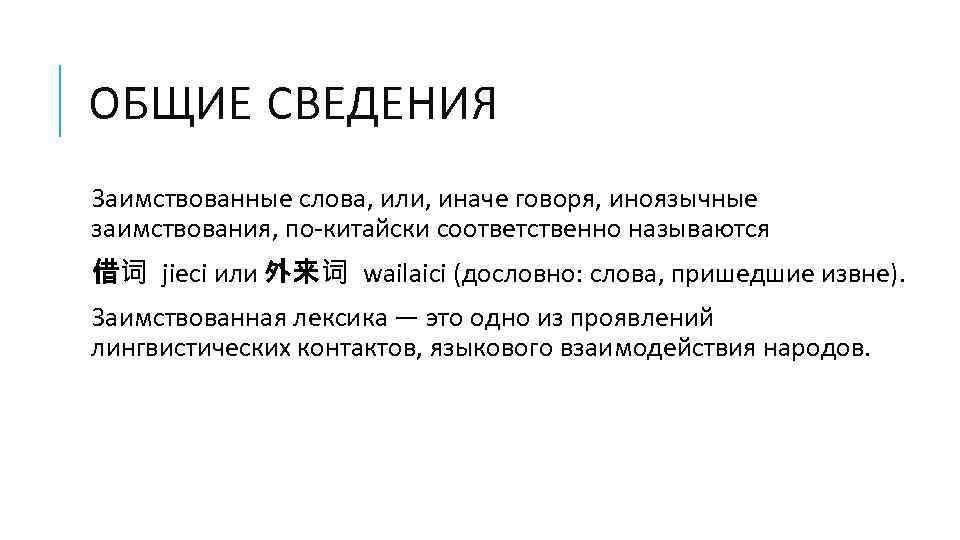 ОБЩИЕ СВЕДЕНИЯ Заимствованные слова, или, иначе говоря, иноязычные заимствования, по-китайски соответственно называются 借词 jieci или 外来词 wailaici (дословно: слова, пришедшие извне). Заимствованная лексика — это одно из проявлений лингвистических контактов, языкового взаимодействия народов.