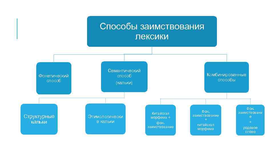 Способы заимствования лексики Фонетический способ Структурные кальки Семантический способ Комбинированные способы (кальки) Этимологически е кальки Китайская морфема + фон. заимствование Фон. заимствование + китайская морфема Фон. заимствовани е + родовое слово