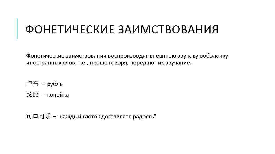 ФОНЕТИЧЕСКИЕ ЗАИМСТВОВАНИЯ Фонетические заимствования воспроизводят внешнюю звуковуюоболочку иностранных слов, т. е. , проще говоря, передают их звучание. 卢布 – рубль 戈比 – копейка 可口可乐 – “каждый глоток доставляет радость”