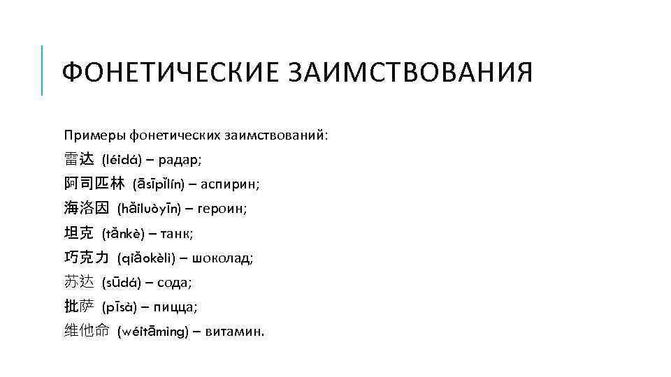 ФОНЕТИЧЕСКИЕ ЗАИМСТВОВАНИЯ Примеры фонетических заимствований: 雷达 (léidá) – радар; 阿司匹林 (āsīpǐlín) – аспирин; 海洛因 (hǎiluòyīn) – героин; 坦克 (tǎnkè) – танк; 巧克力 (qiǎokèlì) – шоколад; 苏达 (sūdá) – сода; 批萨 (pīsà) – пицца; 维他命 (wéitāmìng) – витамин.