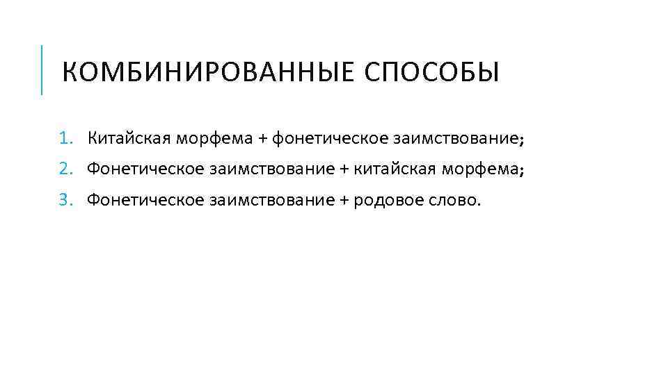 КОМБИНИРОВАННЫЕ СПОСОБЫ 1. Китайская морфема + фонетическое заимствование; 2. Фонетическое заимствование + китайская морфема; 3. Фонетическое заимствование + родовое слово.