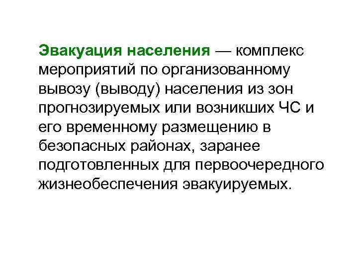 Эвакуация населения — комплекс мероприятий по организованному вывозу (выводу) населения из зон прогнозируемых или возникших ЧС и его временному размещению в безопасных районах, заранее подготовленных для первоочередного жизнеобеспечения эвакуируемых.