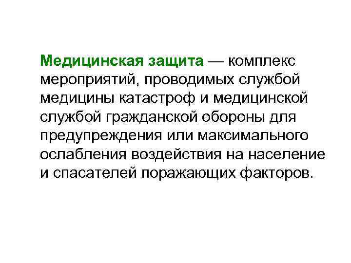 Медицинская защита — комплекс мероприятий, проводимых службой медицины катастроф и медицинской службой гражданской обороны для предупреждения или максимального ослабления воздействия на население и спасателей поражающих факторов.