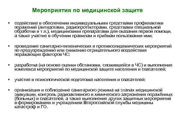 Мероприятия по медицинской защите • содействие в обеспечении индивидуальными средствами профилактики поражений (антидотами, радиопротекторами, средствами специальной обработки и т. п. ), медицинскими препаратами для оказания первой помощи, а также участие в обучении правилам и приёмам пользования ими; • проведение санитарно гигиенических и противоэпидемических мероприятий по предупреждению или снижению отрицательного воздействия поражающих факторов ЧС; • разработка (на основе оценки обстановки, сложившейся в ЧС) и выполнение комплекса мероприятий по медицинской защите населения и спасателей; • участие в психологической подготовке населения и спасателей; • организация и соблюдение санитарного режима на этапах медицинской эвакуации, контроль радиоактивного и химического загрязнения поражённых (больных) и спасателей, а также выполнение других защитных мероприятий в формированиях и учреждениях Всероссийской службы медицины катастроф и ГО.