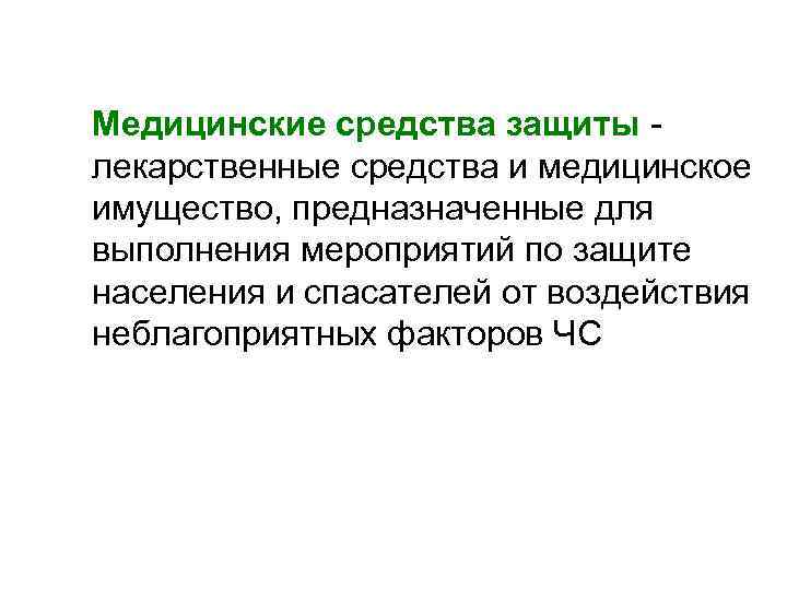 Медицинские средства защиты лекарственные средства и медицинское имущество, предназначенные для выполнения мероприятий по защите населения и спасателей от воздействия неблагоприятных факторов ЧС