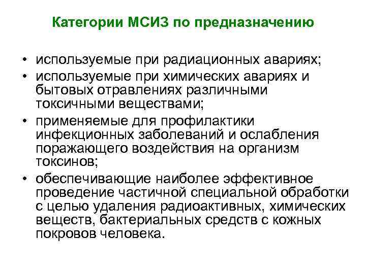 Категории МСИЗ по предназначению • используемые при радиационных авариях; • используемые при химических авариях и бытовых отравлениях различными токсичными веществами; • применяемые для профилактики инфекционных заболеваний и ослабления поражающего воздействия на организм токсинов; • обеспечивающие наиболее эффективное проведение частичной специальной обработки с целью удаления радиоактивных, химических веществ, бактериальных средств с кожных покровов человека.