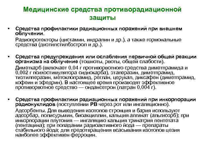 Медицинские средства противорадиационной защиты • Средства профилактики радиационных поражений при внешнем облучении. Радиопротекторы (цистамин, индралин и др. ), а также гормональные средства (диэтилстилбэстрол и др. ). • Средства предупреждения или ослабления первичной общей реакции организма на облучение (тошноты, рвоты, общей слабости). Диметкарб (включает 0, 04 г противорвотного средства диметпрамида и 0, 002 г психостимулятора сиднокарба), этаперазин, диметпрамид, тиэтилперазин, метоклопрамид, реглан, церукал, диксафен (диметпрамид, кофеин и эфедрин). В настоящее время производят эффективное противорвотное средство — ондансетрон (латран 0, 004 г). • Средства профилактики радиационных поражений при инкорпорации радионуклидов (поступлении РВ через рот или ингаляционно). Адсорбенты. Для выведения изотопов стронция и бария используют адсорбар, полисурьмин, биоакциллин, кальция алгинат (альгисорб); при инкорпорации плутония — ингаляцию кальция тринатрия пентетата (пентацина); при попадании радиоактивного йода — препараты стабильного йода; для предотвращения всасывания изотопов цезия наиболее эффективен ферроцин.