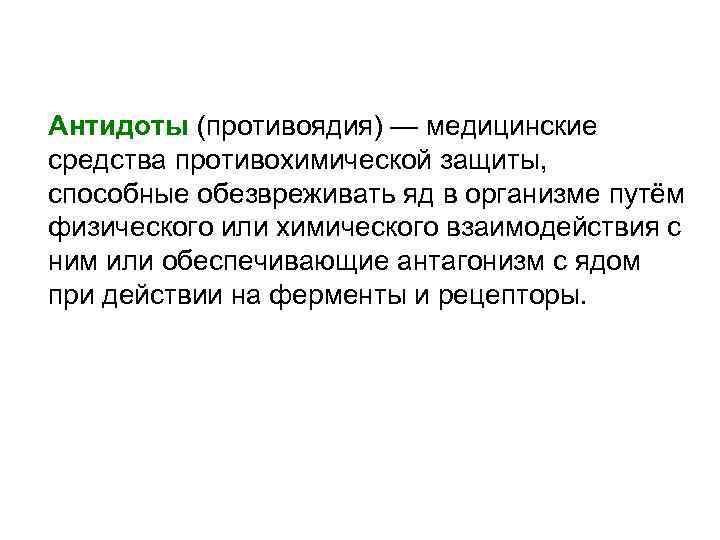 Антидоты (противоядия) — медицинские средства противохимической защиты, способные обезвреживать яд в организме путём физического или химического взаимодействия с ним или обеспечивающие антагонизм с ядом при действии на ферменты и рецепторы.