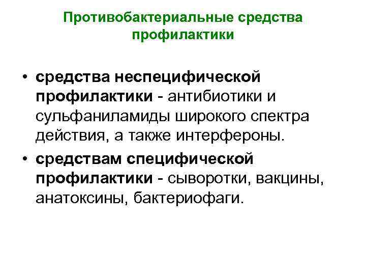 Противобактериальные средства профилактики • средства неспецифической профилактики антибиотики и сульфаниламиды широкого спектра действия, а также интерфероны. • средствам специфической профилактики сыворотки, вакцины, анатоксины, бактериофаги.