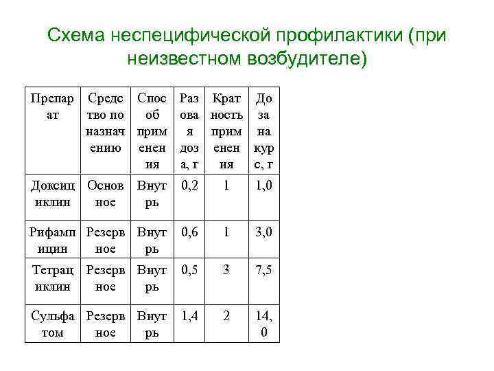 Схема неспецифической профилактики (при неизвестном возбудителе) Препар Средс Спос Раз Крат До ат тво по об ова ность за назнач прим я прим на ению енен доз енен кур ия а, г ия с, г Доксиц Основ Внут 0, 2 1 1, 0 иклин ное рь Рифамп Резерв Внут 0, 6 1 3, 0 ицин ное рь Тетрац Резерв Внут 0, 5 3 7, 5 иклин ное рь Сульфа Резерв Внут 1, 4 2 14, том ное рь 0