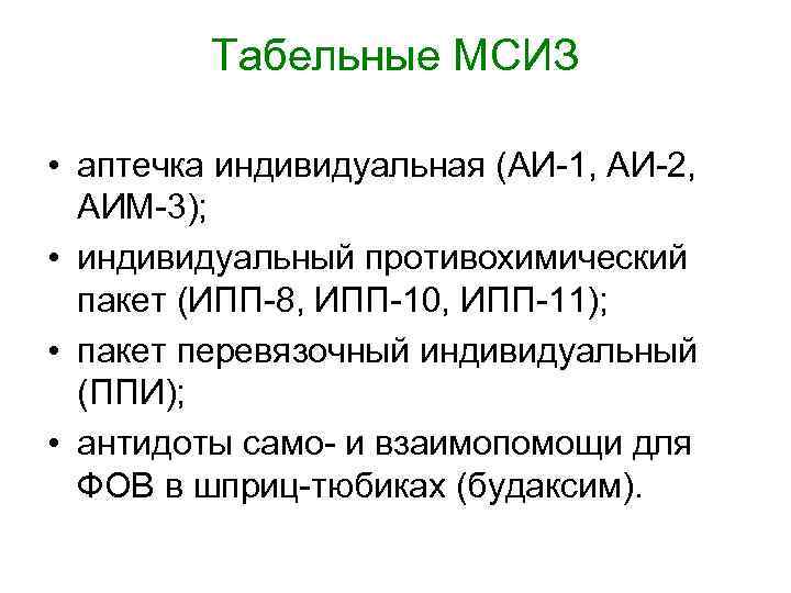 Табельные МСИЗ • аптечка индивидуальная (АИ 1, АИ 2, АИМ 3); • индивидуальный противохимический пакет (ИПП 8, ИПП 10, ИПП 11); • пакет перевязочный индивидуальный (ППИ); • антидоты само и взаимопомощи для ФОВ в шприц тюбиках (будаксим).