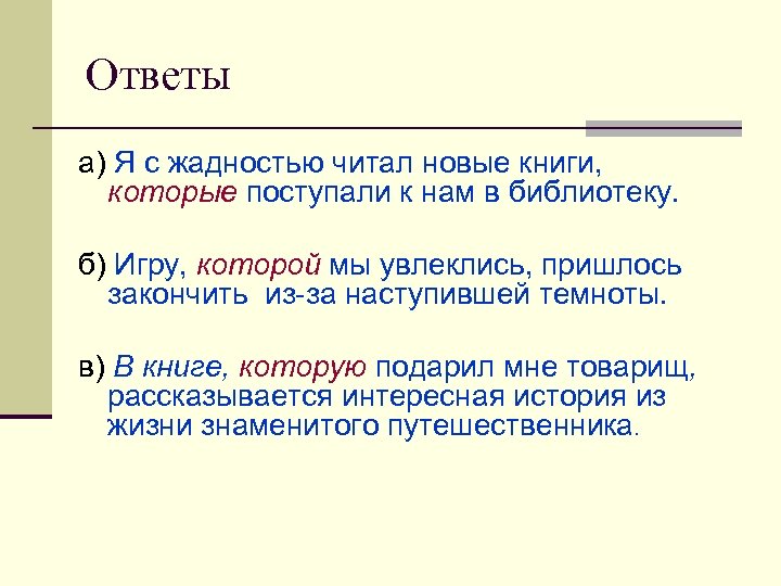 Ответы а) Я с жадностью читал новые книги, которые поступали к нам в библиотеку. б) Игру, которой мы увлеклись, пришлось закончить из-за наступившей темноты. в) В книге, которую подарил мне товарищ, рассказывается интересная история из жизни знаменитого путешественника.
