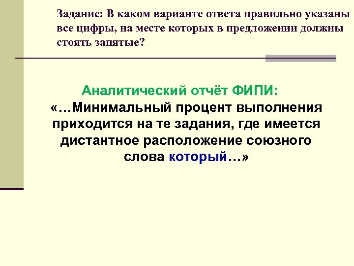 Задание: В каком варианте ответа правильно указаны все цифры, на месте которых в предложении должны стоять запятые? Аналитический отчёт ФИПИ: «…Минимальный процент выполнения приходится на те задания, где имеется дистантное расположение союзного слова который…»
