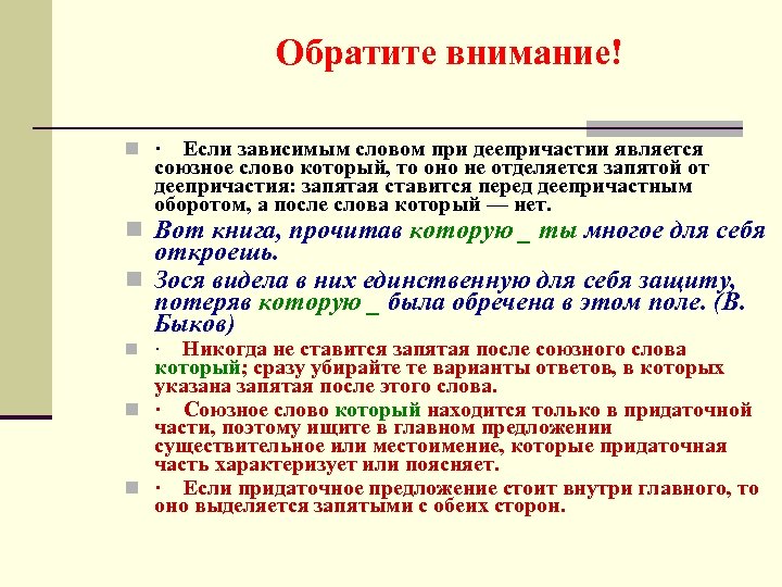 Обратите внимание! n · Если зависимым словом при деепричастии является союзное слово который, то оно не отделяется запятой от деепричастия: запятая ставится перед деепричастным оборотом, а после слова который — нет. n Вот книга, прочитав которую _ ты многое для себя откроешь. n Зося видела в них единственную для себя защиту, потеряв которую _ была обречена в этом поле. (В. Быков) Никогда не ставится запятая после союзного слова который; сразу убирайте те варианты ответов, в которых указана запятая после этого слова. n · Союзное слово который находится только в придаточной части, поэтому ищите в главном предложении существительное или местоимение, которые придаточная часть характеризует или поясняет. n · Если придаточное предложение стоит внутри главного, то оно выделяется запятыми с обеих сторон. n ·