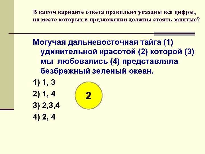 В каком варианте ответа правильно указаны все цифры, на месте которых в предложении должны стоять запятые? Могучая дальневосточная тайга (1) удивительной красотой (2) которой (3) мы любовались (4) представляла безбрежный зеленый океан. 1) 1, 3 2) 1, 4 2 3) 2, 3, 4 4) 2, 4