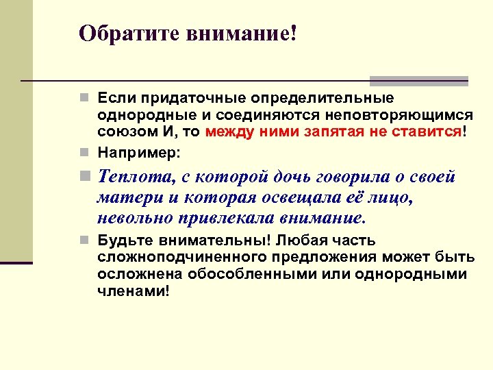 Обратите внимание! n Если придаточные определительные однородные и соединяются неповторяющимся союзом И, то между ними запятая не ставится! n Например: n Теплота, с которой дочь говорила о своей матери и которая освещала её лицо, невольно привлекала внимание. n Будьте внимательны! Любая часть сложноподчиненного предложения может быть осложнена обособленными или однородными членами!