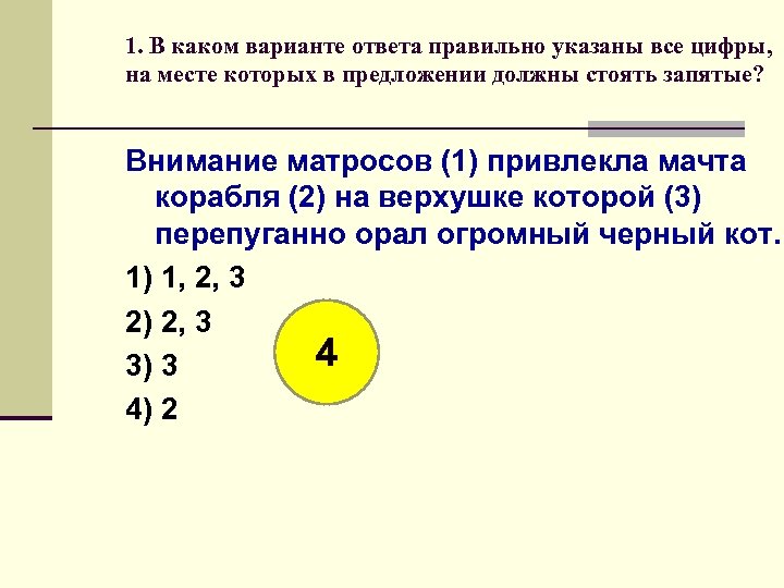 1. В каком варианте ответа правильно указаны все цифры, на месте которых в предложении должны стоять запятые? Внимание матросов (1) привлекла мачта корабля (2) на верхушке которой (3) перепуганно орал огромный черный кот. 1) 1, 2, 3 2) 2, 3 4 3) 3 4) 2