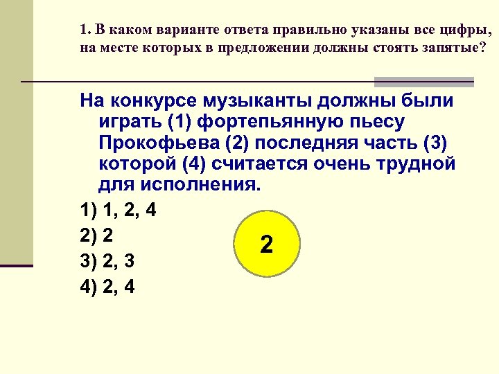 1. В каком варианте ответа правильно указаны все цифры, на месте которых в предложении должны стоять запятые? На конкурсе музыканты должны были играть (1) фортепьянную пьесу Прокофьева (2) последняя часть (3) которой (4) считается очень трудной для исполнения. 1) 1, 2, 4 2) 2 2 3) 2, 3 4) 2, 4