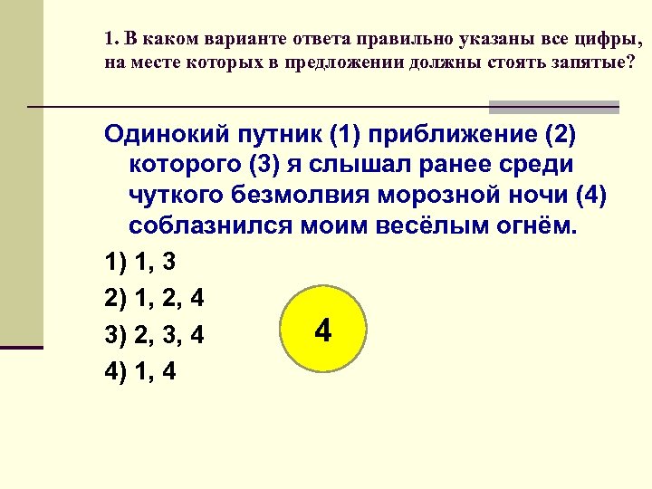 1. В каком варианте ответа правильно указаны все цифры, на месте которых в предложении должны стоять запятые? Одинокий путник (1) приближение (2) которого (3) я слышал ранее среди чуткого безмолвия морозной ночи (4) соблазнился моим весёлым огнём. 1) 1, 3 2) 1, 2, 4 4 3) 2, 3, 4 4) 1, 4