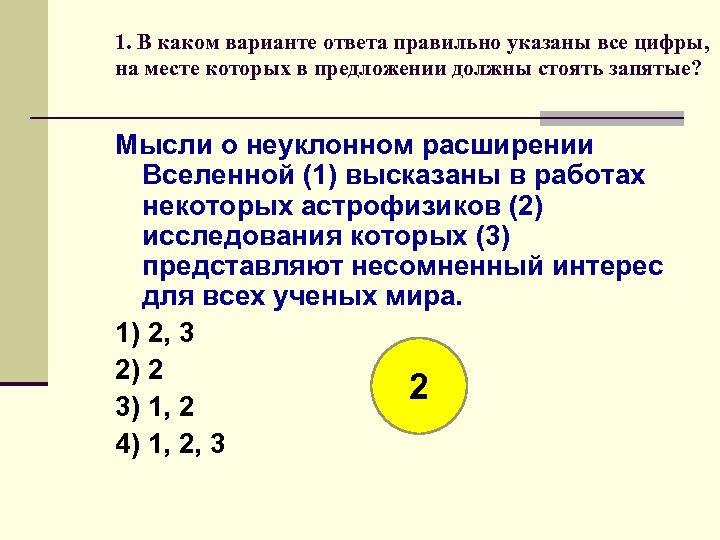 1. В каком варианте ответа правильно указаны все цифры, на месте которых в предложении должны стоять запятые? Мысли о неуклонном расширении Вселенной (1) высказаны в работах некоторых астрофизиков (2) исследования которых (3) представляют несомненный интерес для всех ученых мира. 1) 2, 3 2) 2 2 3) 1, 2 4) 1, 2, 3