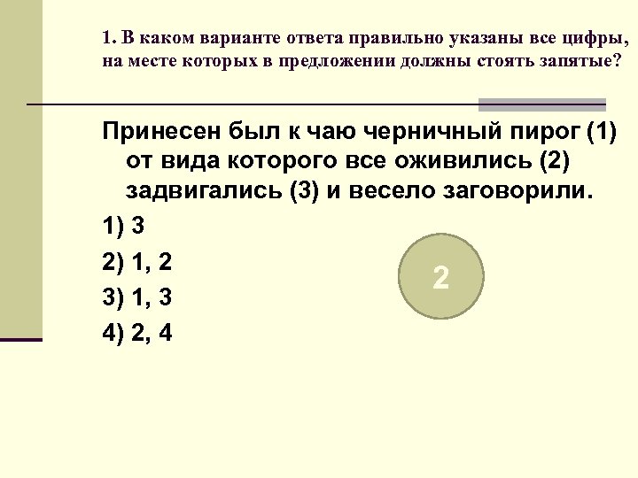 1. В каком варианте ответа правильно указаны все цифры, на месте которых в предложении должны стоять запятые? Принесен был к чаю черничный пирог (1) от вида которого все оживились (2) задвигались (3) и весело заговорили. 1) 3 2) 1, 2 2 3) 1, 3 4) 2, 4