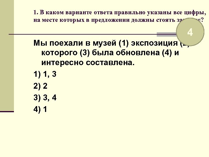 1. В каком варианте ответа правильно указаны все цифры, на месте которых в предложении должны стоять запятые? 4 Мы поехали в музей (1) экспозиция (2) которого (3) была обновлена (4) и интересно составлена. 1) 1, 3 2) 2 3) 3, 4 4) 1