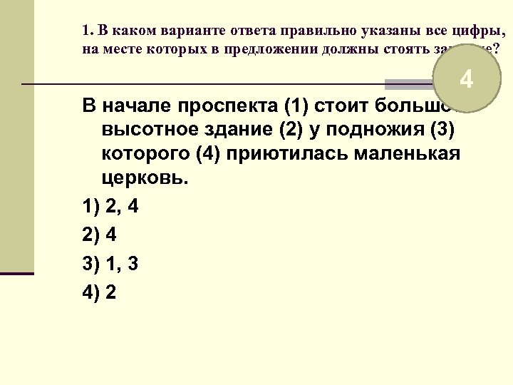 1. В каком варианте ответа правильно указаны все цифры, на месте которых в предложении должны стоять запятые? 4 В начале проспекта (1) стоит большое высотное здание (2) у подножия (3) которого (4) приютилась маленькая церковь. 1) 2, 4 2) 4 3) 1, 3 4) 2