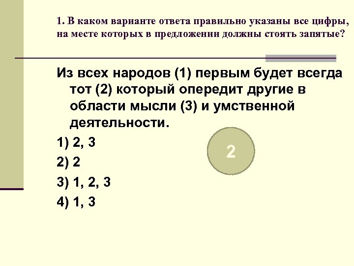 1. В каком варианте ответа правильно указаны все цифры, на месте которых в предложении должны стоять запятые? Из всех народов (1) первым будет всегда тот (2) который опередит другие в области мысли (3) и умственной деятельности. 1) 2, 3 2 2) 2 3) 1, 2, 3 4) 1, 3