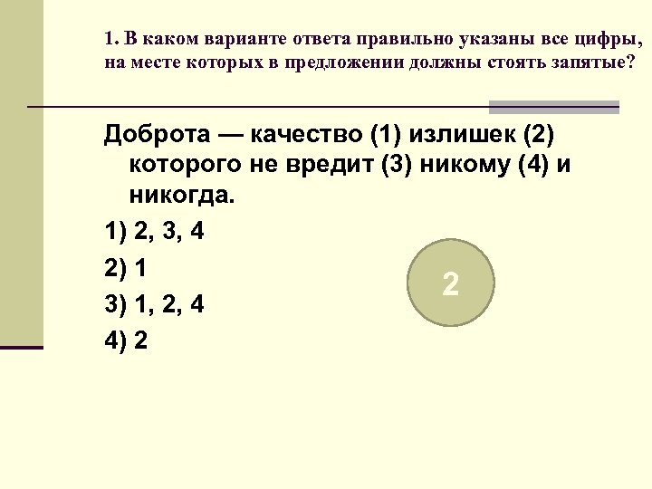 1. В каком варианте ответа правильно указаны все цифры, на месте которых в предложении должны стоять запятые? Доброта — качество (1) излишек (2) которого не вредит (3) никому (4) и никогда. 1) 2, 3, 4 2) 1 2 3) 1, 2, 4 4) 2