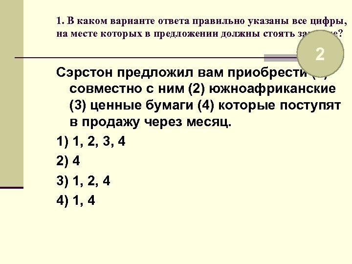 1. В каком варианте ответа правильно указаны все цифры, на месте которых в предложении должны стоять запятые? 2 Сэрстон предложил вам приобрести (1) совместно с ним (2) южноафриканские (3) ценные бумаги (4) которые поступят в продажу через месяц. 1) 1, 2, 3, 4 2) 4 3) 1, 2, 4 4) 1, 4