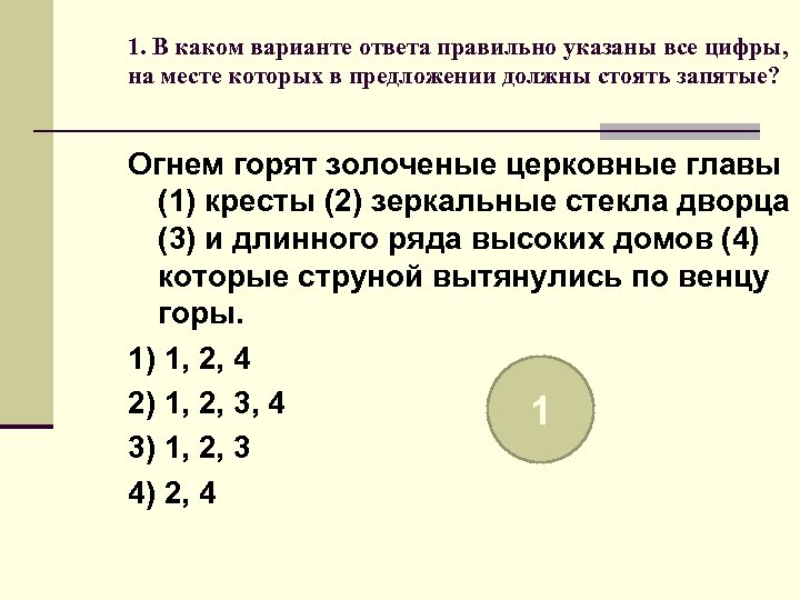 1. В каком варианте ответа правильно указаны все цифры, на месте которых в предложении должны стоять запятые? Огнем горят золоченые церковные главы (1) кресты (2) зеркальные стекла дворца (3) и длинного ряда высоких домов (4) которые струной вытянулись по венцу горы. 1) 1, 2, 4 2) 1, 2, 3, 4 1 3) 1, 2, 3 4) 2, 4