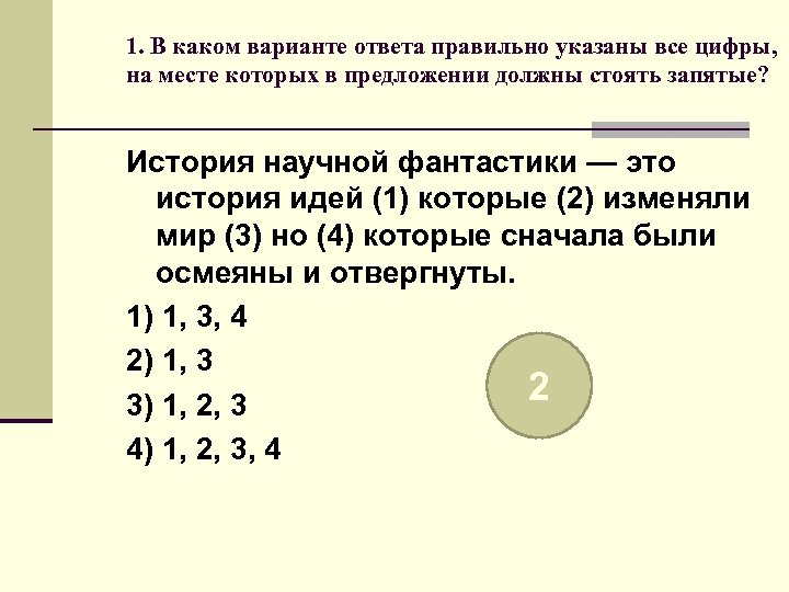 1. В каком варианте ответа правильно указаны все цифры, на месте которых в предложении должны стоять запятые? История научной фантастики — это история идей (1) которые (2) изменяли мир (3) но (4) которые сначала были осмеяны и отвергнуты. 1) 1, 3, 4 2) 1, 3 2 3) 1, 2, 3 4) 1, 2, 3, 4