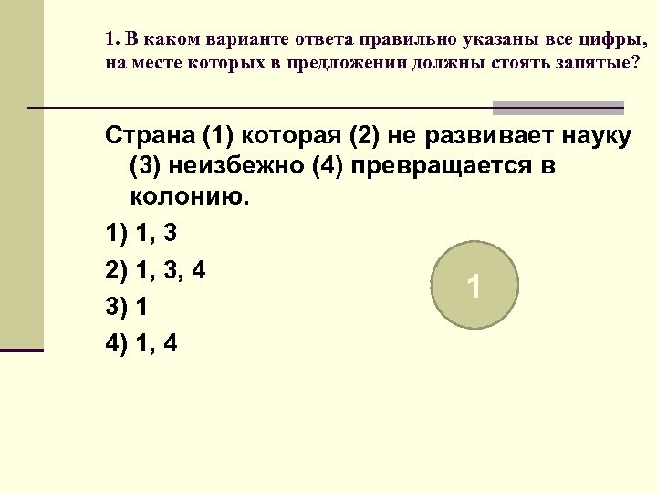 1. В каком варианте ответа правильно указаны все цифры, на месте которых в предложении должны стоять запятые? Страна (1) которая (2) не развивает науку (3) неизбежно (4) превращается в колонию. 1) 1, 3 2) 1, 3, 4 1 3) 1 4) 1, 4
