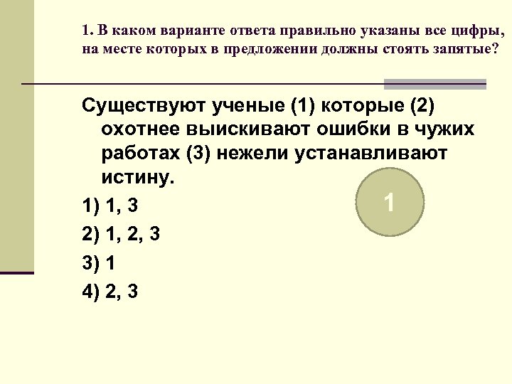 1. В каком варианте ответа правильно указаны все цифры, на месте которых в предложении должны стоять запятые? Существуют ученые (1) которые (2) охотнее выискивают ошибки в чужих работах (3) нежели устанавливают истину. 1 1) 1, 3 2) 1, 2, 3 3) 1 4) 2, 3