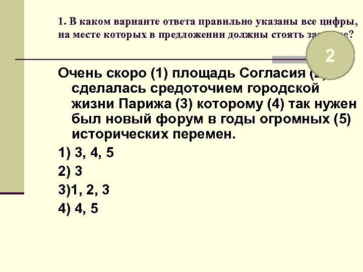 1. В каком варианте ответа правильно указаны все цифры, на месте которых в предложении должны стоять запятые? 2 Очень скоро (1) площадь Согласия (2) сделалась средоточием городской жизни Парижа (3) которому (4) так нужен был новый форум в годы огромных (5) исторических перемен. 1) 3, 4, 5 2) 3 3)1, 2, 3 4) 4, 5