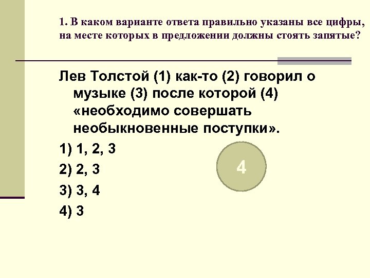 1. В каком варианте ответа правильно указаны все цифры, на месте которых в предложении должны стоять запятые? Лев Толстой (1) как-то (2) говорил о музыке (3) после которой (4) «необходимо совершать необыкновенные поступки» . 1) 1, 2, 3 4 2) 2, 3 3) 3, 4 4) 3
