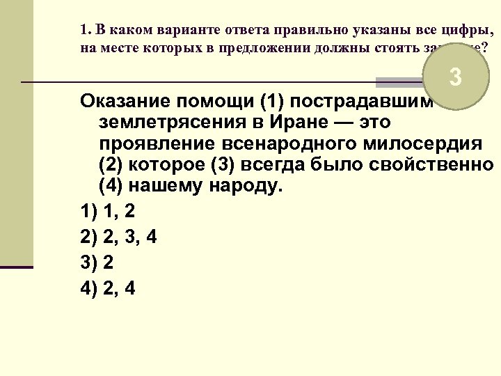 1. В каком варианте ответа правильно указаны все цифры, на месте которых в предложении должны стоять запятые? 3 Оказание помощи (1) пострадавшим от землетрясения в Иране — это проявление всенародного милосердия (2) которое (3) всегда было свойственно (4) нашему народу. 1) 1, 2 2) 2, 3, 4 3) 2 4) 2, 4