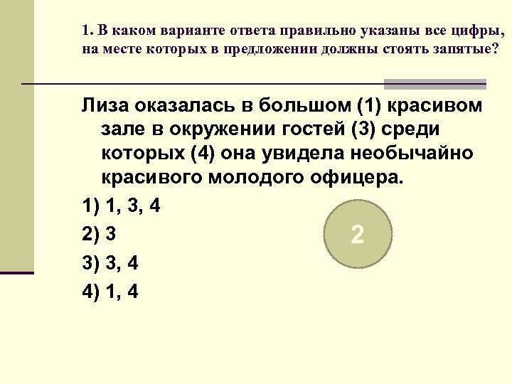 1. В каком варианте ответа правильно указаны все цифры, на месте которых в предложении должны стоять запятые? Лиза оказалась в большом (1) красивом зале в окружении гостей (3) среди которых (4) она увидела необычайно красивого молодого офицера. 1) 1, 3, 4 2) 3 2 3) 3, 4 4) 1, 4