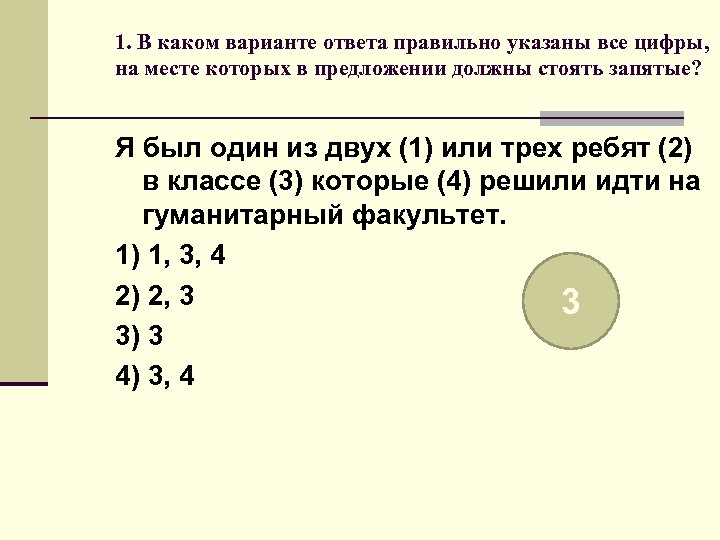 1. В каком варианте ответа правильно указаны все цифры, на месте которых в предложении должны стоять запятые? Я был один из двух (1) или трех ребят (2) в классе (3) которые (4) решили идти на гуманитарный факультет. 1) 1, 3, 4 2) 2, 3 3 3) 3 4) 3, 4