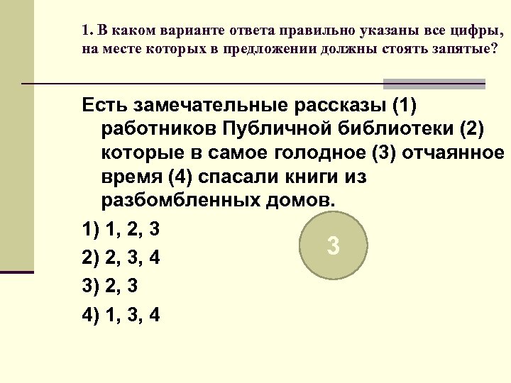 1. В каком варианте ответа правильно указаны все цифры, на месте которых в предложении должны стоять запятые? Есть замечательные рассказы (1) работников Публичной библиотеки (2) которые в самое голодное (3) отчаянное время (4) спасали книги из разбомбленных домов. 1) 1, 2, 3 3 2) 2, 3, 4 3) 2, 3 4) 1, 3, 4