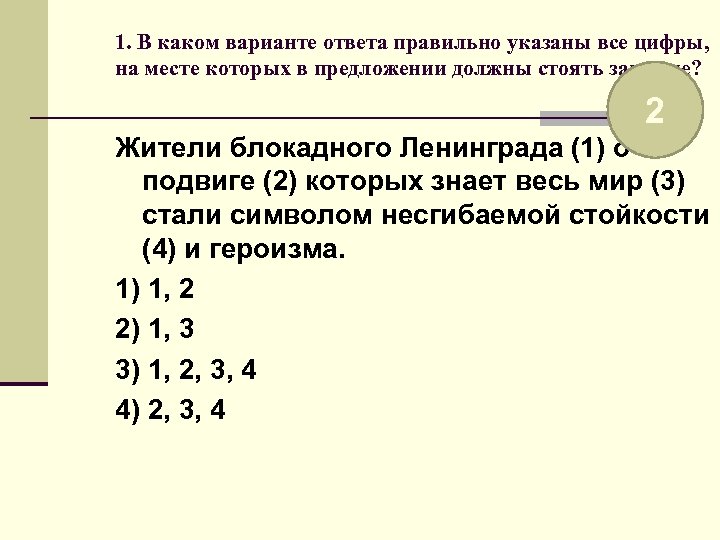 1. В каком варианте ответа правильно указаны все цифры, на месте которых в предложении должны стоять запятые? 2 Жители блокадного Ленинграда (1) о подвиге (2) которых знает весь мир (3) стали символом несгибаемой стойкости (4) и героизма. 1) 1, 2 2) 1, 3 3) 1, 2, 3, 4 4) 2, 3, 4