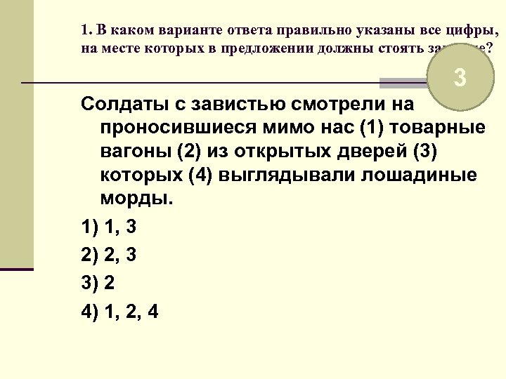 1. В каком варианте ответа правильно указаны все цифры, на месте которых в предложении должны стоять запятые? 3 Солдаты с завистью смотрели на проносившиеся мимо нас (1) товарные вагоны (2) из открытых дверей (3) которых (4) выглядывали лошадиные морды. 1) 1, 3 2) 2, 3 3) 2 4) 1, 2, 4